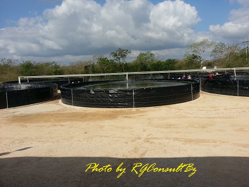 Visited the Kin Yuc Tilapia farm in Motul, abour 50 Km from Merida Yucatan Mexico. The farm has 6 – 12M Diameter tanks and 2-8M Diameter tanks, the former for the larger fish and the latter for the fingerlings.